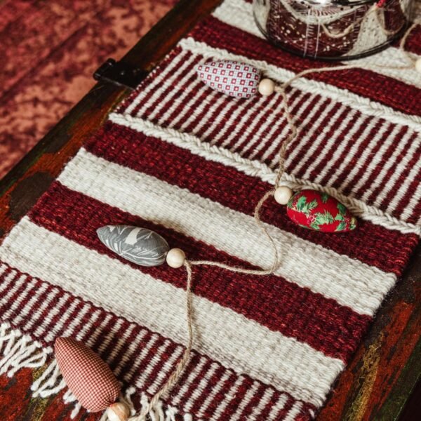Handwoven from 100% locally produced wool yarn. this red woven table runner features a unique red and white striped weaving pattern rooted in North African weaving traditions. Because wool is a natural insulator. these table runners protect your furniture from moisture or heat. easily fitting up to three hot dishes. These runners work beautifully as decor. both functional and beautiful. adding textural interest to your coffee table. dresser. or shelf.