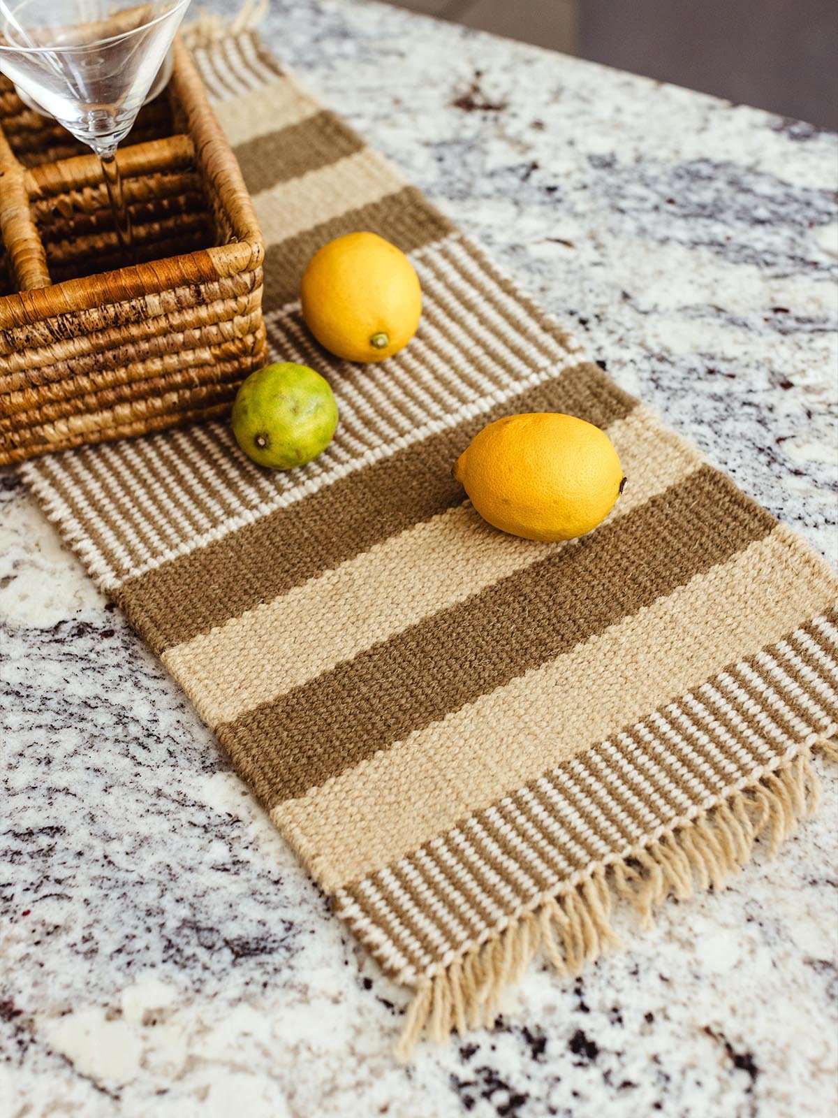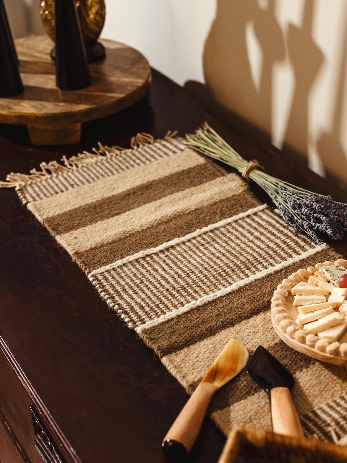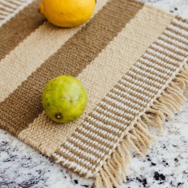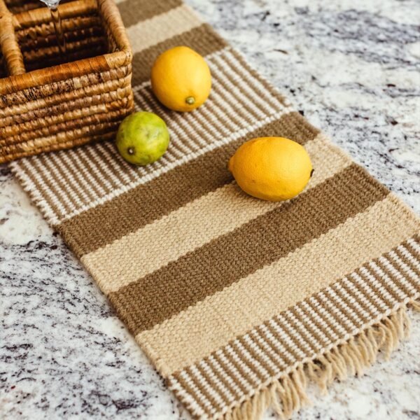 Handwoven from 100% locally produced wool. this short woven table runner is a unique piece of art that protects your furniture from moisture and heat. Both functional and beautiful. these runners can hold up to three hot dishes and feature unique patterns rooted in ancient North African weaving traditions.